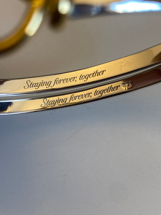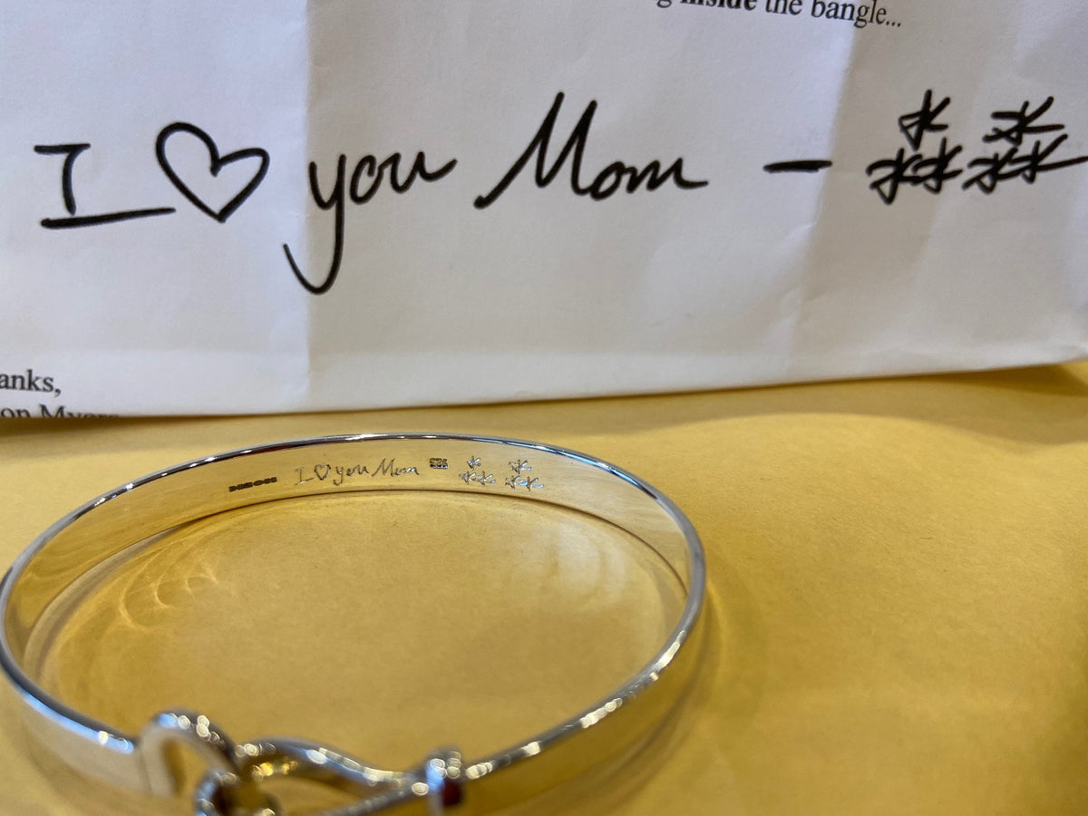 Engravings are available in bold block font designs (pendant) and elegant cursive (bangle).