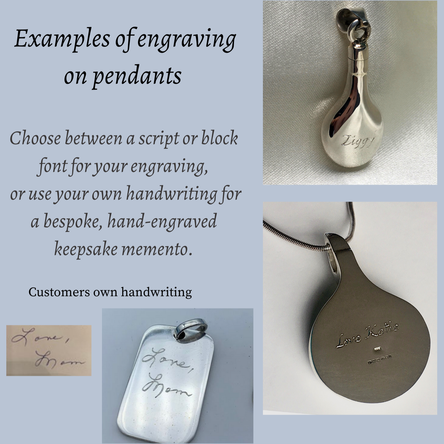You can also have your own handwriting, a simple drawing or design copied directly onto the jewellery. Please get in touch if you would like this bespoke service or if you require more intricate and elaborate fonts or designs.